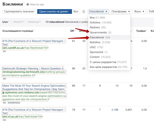 1. Поиск и подбор тематических или смежных с вашей нишей площадок .edu и .gov