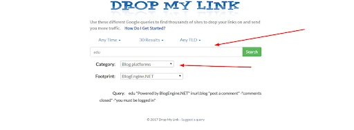 2. Используйте программу Drop My Link, выбрав нужные критерии поиска площадок (блоги, гостевые сообщения, обратные ссылки форума и другое)